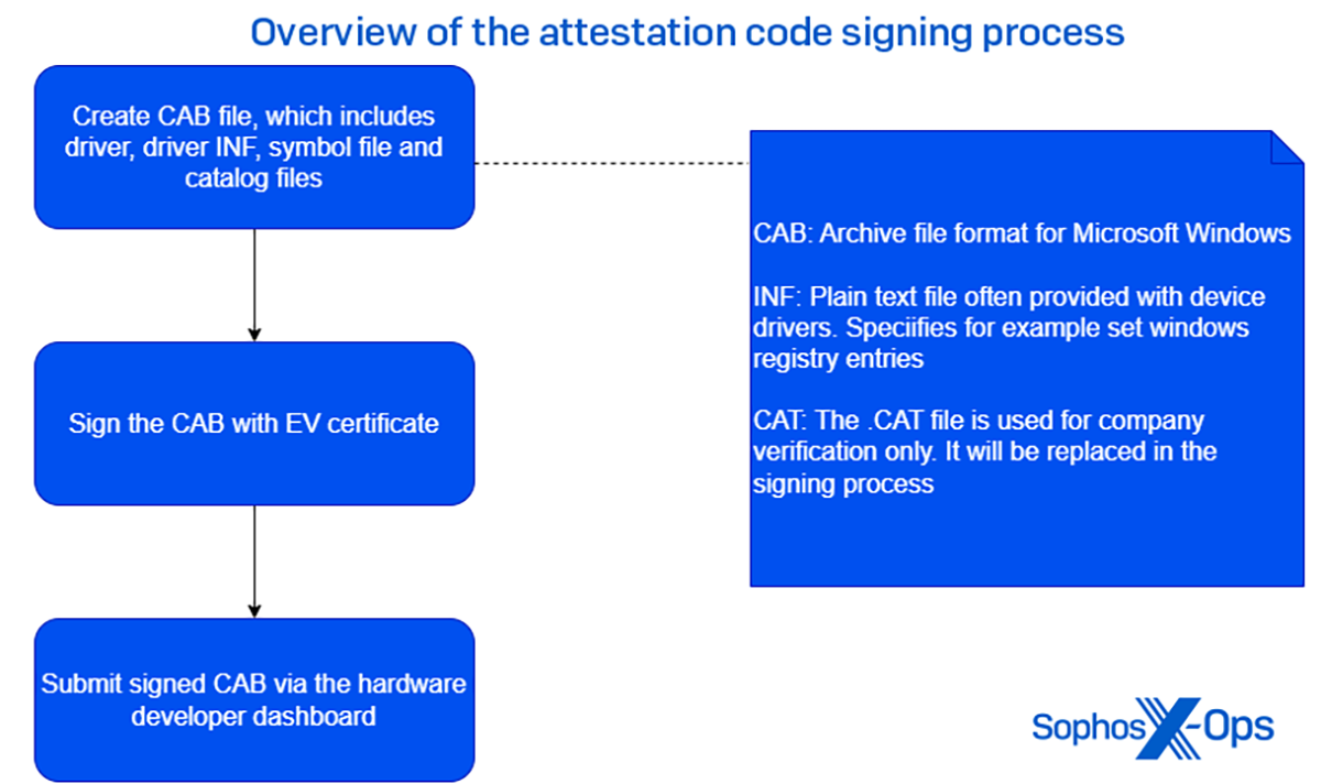 Si ces exigences sont remplies, ils peuvent préparer un fichier CAB, qui inclut le pilote lui-même, le signer avec le certificat EV et le soumettre au tableau de bord (dashboard).