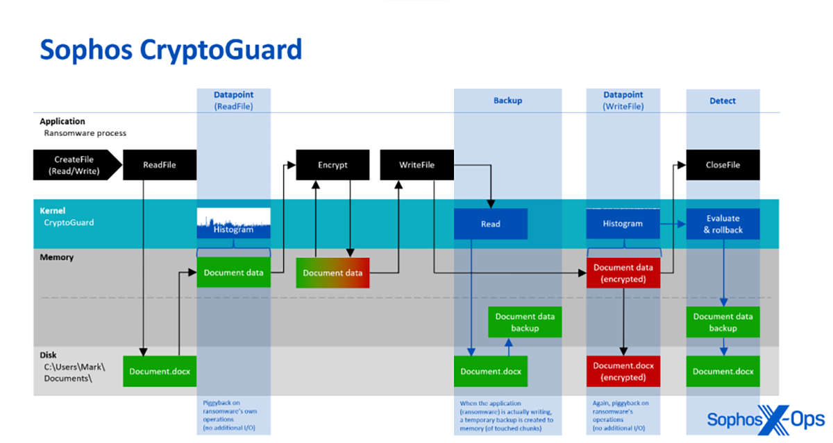 Contrairement à la majorité des approches décrites ci-dessus, CryptoGuard ne recherche absolument pas les attaquants, les exécutables de ransomware ou bien les modèles de comportement malveillant. D’autres solutions de sécurité, notamment les produits Sophos, proposent bien sûr ce type de fonctionnalité, et c’est d’ailleurs un élément fondamental d’une défense multicouche, qui empêche idéalement les attaquants d’accéder à la phase de chiffrement, mais CryptoGuard lui-même utilise une approche plus asymétrique, lorsque ces couches ont été contournées.