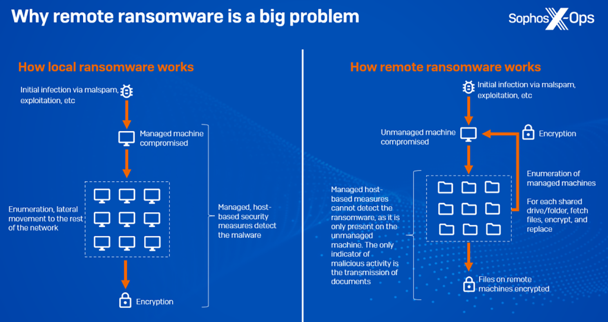 L’un des développements les plus importants est l’augmentation des ransomwares distant : l’exploitation de l’architecture de domaine d’une entreprise pour chiffrer les données présentes sur les machines gérées appartenant à un domaine particulier. Toutes les activités malveillantes (accès initial, exécution des charges virales et chiffrement) se produisent sur une machine non gérée, contournant ainsi les piles de sécurité modernes, le seul indicateur de compromission étant la transmission de documents vers et depuis d’autres machines. Notre télémétrie indique qu’il y a eu une augmentation de 62 %, d’une année sur l’autre, des attaques intentionnelles débouchant sur un chiffrement à distance depuis 2022. De plus, le rapport de défense numérique Microsoft 2023 indique qu’environ 60 % des attaques de ransomware pilotées manuellement impliquent un chiffrement à distance, et que 80 % de toutes les compromissions proviennent d’appareils non gérés, révélant ainsi clairement un manque de gestion active des ressources/actifs. Les familles de ransomware connues pour utiliser un chiffrement à distance incluent Akira, ALPHV/BlackCat, BlackMatter, LockBit et Royal. Il s’agit d’une technique qui existe depuis un certain temps : en effet, dès 2013, CryptoLocker ciblait déjà les partages réseau.