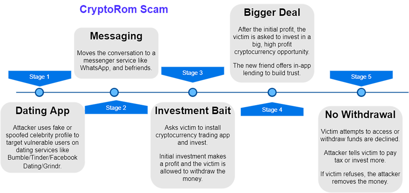 En mai dernier, nous avons publié un rapport sur les escrocs utilisant des sites et des applications de rencontres afin d’inciter les victimes, par le biais de techniques d’ingénierie sociale, à installer de fausses applications de cryptomonnaie sur des iPhone et sur Android. À l’époque, les éléments en notre possession suggéraient que les escrocs utilisant ces applications ciblaient exclusivement des victimes en Asie. Mais entre-temps, nous avons obtenu de plus en plus de preuves que ces fausses applications font en réalité partie d’une arnaque mondiale de grande envergure. Nous avons entendu parler de victimes en Europe, pour la plupart des utilisateurs d’iPhone, qui ont perdu des milliers de dollars au profit d’escrocs ayant utilisé de telles escroqueries. Nous avons également identifié encore d’autres applications liées à cette campagne d’escroquerie que nous avons surnommée CryptoRom, du fait de l’association d’une arnaque aux sentiments avec une fraude à la cryptomonnaie.
