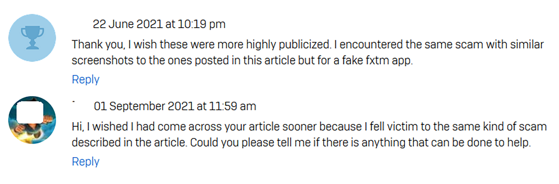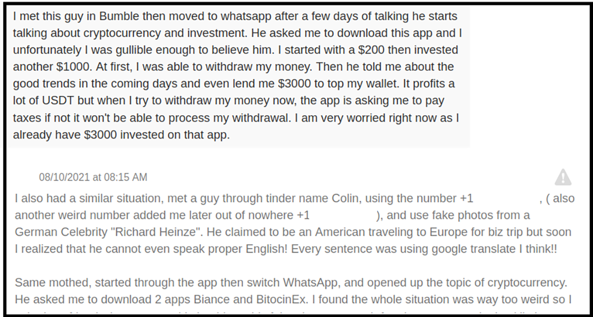 Nous avons consulté les sites de bases de données d’arnaques à la recherche d’URL associées à ces escroqueries mais aussi pour obtenir d’éventuels commentaires de la part de ceux ayant été ciblé par CryptoRom. L’analyse des récits de victimes a permis de mieux comprendre cette opération malveillante :