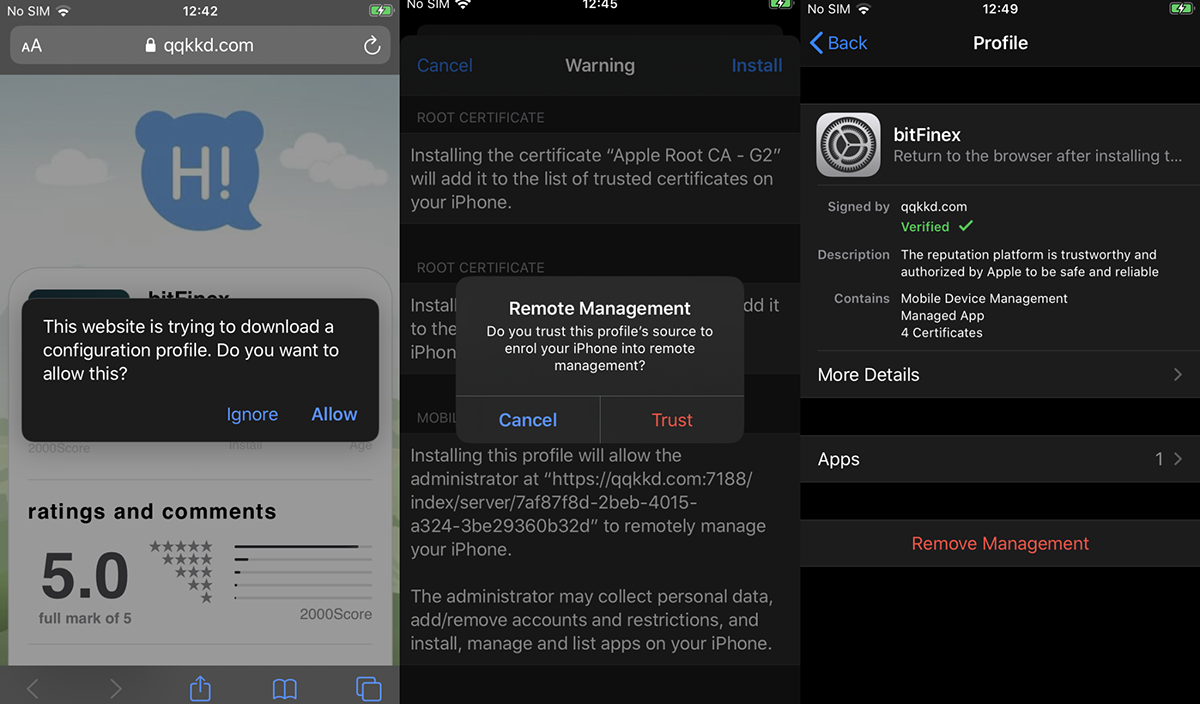 Lorsqu’un utilisateur d’appareil iOS visite l’un des sites utilisés par ces escroqueries, un nouveau profil est téléchargé sur cet appareil. Au lieu d’un profil ad hoc normal, c’est un profil d’approvisionnement MDM signé avec un certificat Enterprise qui est téléchargé. L’utilisateur est alors invité à faire confiance au profil et, après cela, les escrocs peuvent gérer leur appareil en fonction du contenu du profil. Comme présenté dans l’image ci-dessous, les escrocs peuvent potentiellement collecter des données personnelles, ajouter/supprimer des comptes et installer/gérer des applications.