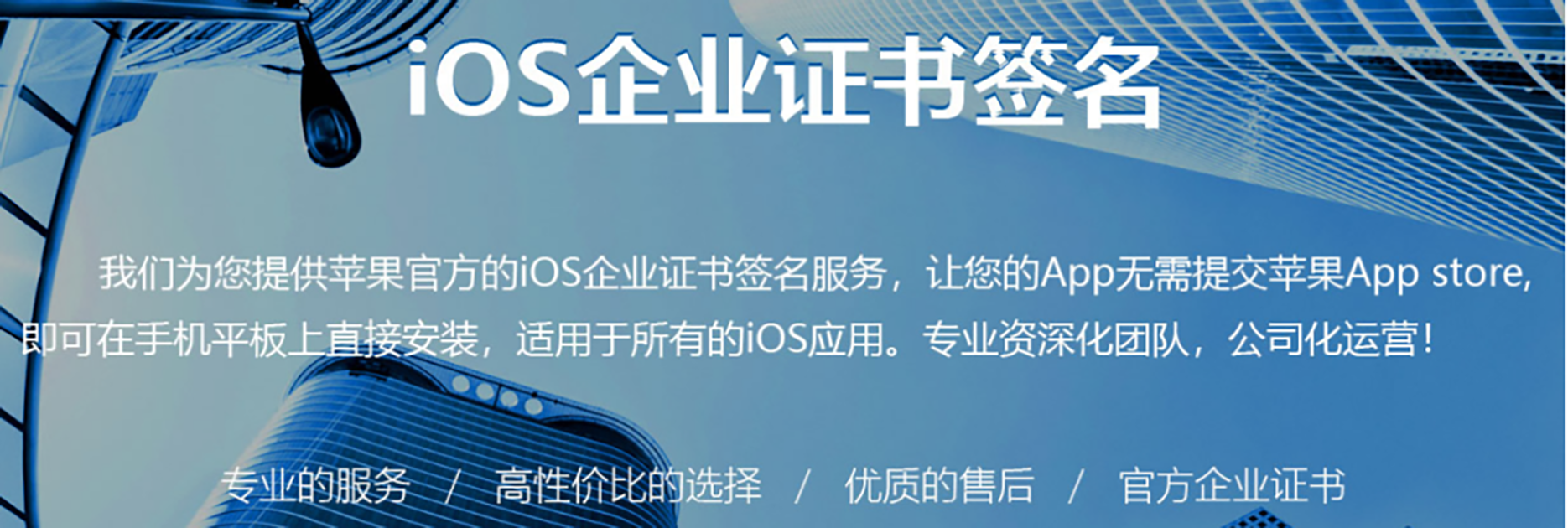 Il existe des services commerciaux qui distribuent des certificats Enterprise et les escrocs abusent de ces services tiers. Vous trouverez ci-dessous une capture d’écran d’un service payant chinois faisant de la publicité pour des signatures Enterprise et mettant en évidence le contournement de vérification au niveau de l’App Store.