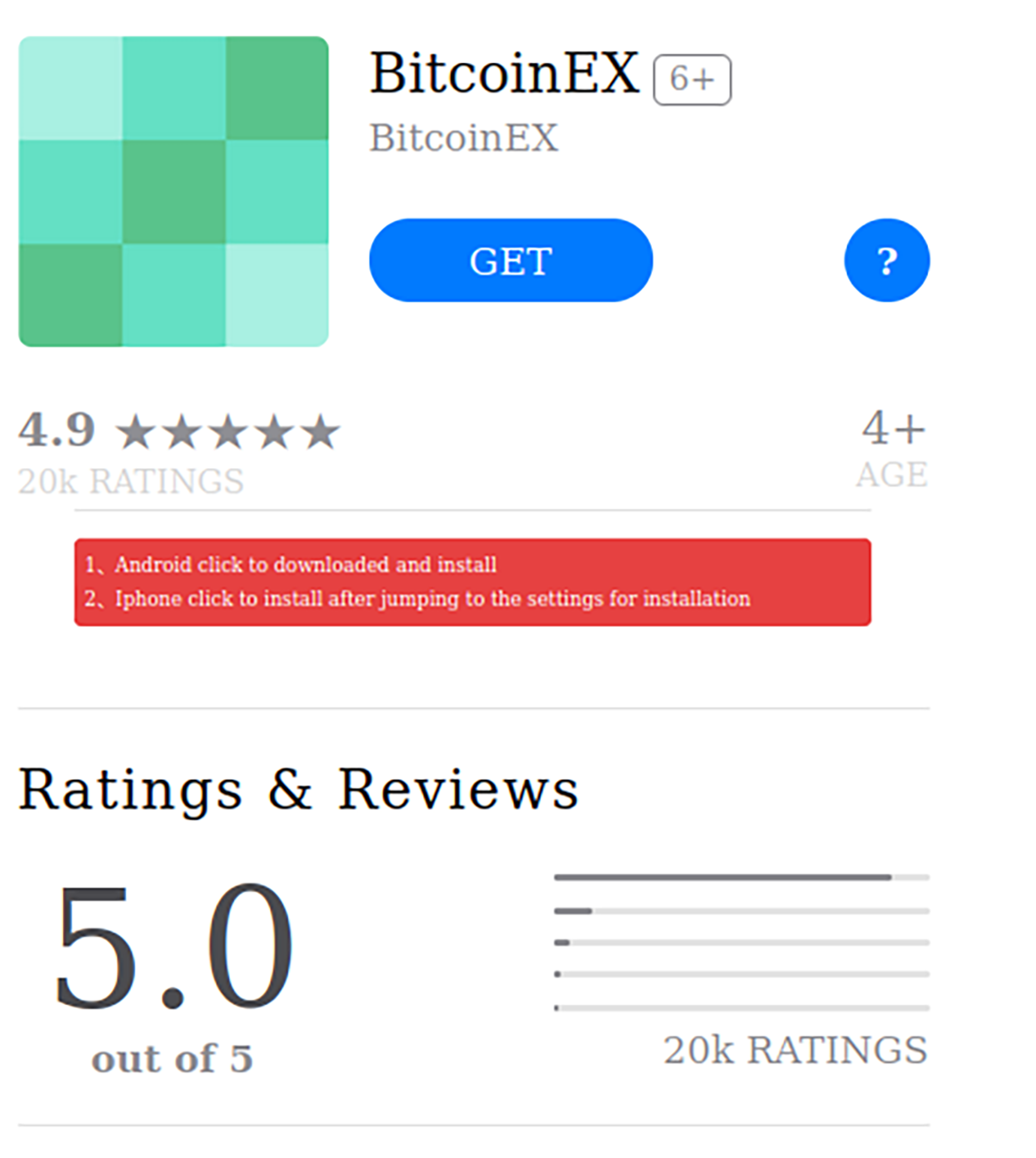 Dans ce cas, les escrocs voulaient que les victimes visitent à nouveau le site Web avec le navigateur de leur appareil. Lorsque le site est visité après avoir fait confiance au profil, le serveur invite alors l’utilisateur à installer une application à partir d’une page qui ressemble à l’App Store d’Apple, avec de faux avis. L’application installée est une fausse version de l’application de trading de cryptomonnaie Bitfinex.