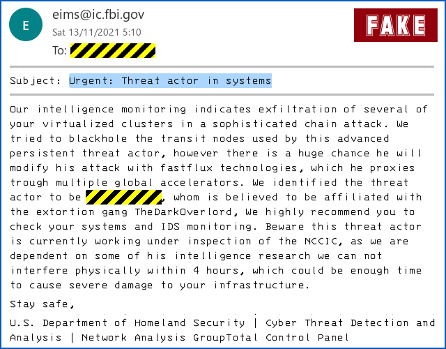 Urgent: Threat actor in systems Our intelligence monitoring indicates exfiltration of several of your virtualized clusters in a sophisticated chain attack. We tried to blackhole the transit nodes used by this advanced persistent threat actor, however there is a huge chance he will modify his attack with fastflux technologies, which he proxies trough multiple global accelerators. We identified the threat actor to be [REDACTED], whom is believed to be affiliated with the extortion gang TheDarkOverlord, We highly recommend you to check your systems and IDS monitoring. Beware this threat actor is currently working under inspection of the NCCIC, as we are dependent on some of his intelligence research we can not interfere physically within 4 hours, which could be enough time to cause severe damage to your infrastructure.