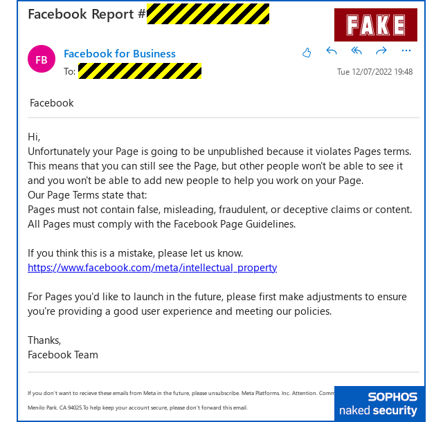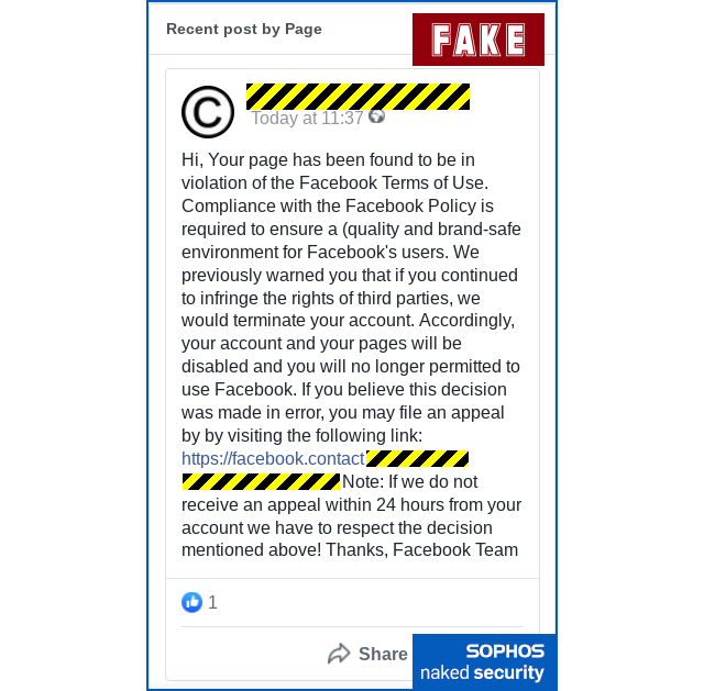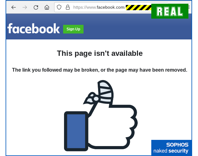 We reported the bogus Page to Facebook as soon as we found it; the good news is that it’s now been knocked offline, thus breaking the connection between the scam email and the fake Facebook domain:
