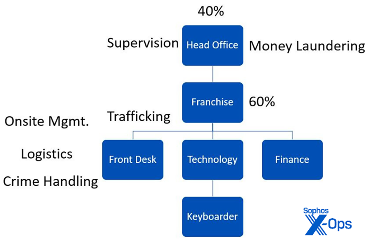 Selon des rapports établis par les services de police chinois qui ont ciblé ces opérations en Chine, les groupes CryptoRom suivent une structure commerciale qui imite un modèle organisationnel d’une entreprise. Au sommet se trouve un siège social, qui s’occupe de la supervision et du blanchiment d’argent. Le siège social sous-traite les opérations d’escroquerie à des organisations affiliées. Ces franchises, également appelées agents, ont leur propre répartition des tâches :