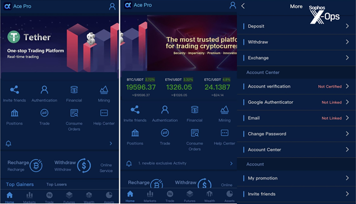 Dans le cas de l’application Ace Pro, les développeurs malveillants ont inséré du code lié au QR checking et à d’autres codes de bibliothèque d’applications iOS dans l’application pour la faire apparaître légitime aux yeux des examinateurs. Mais lorsque l’application a été lancée, elle a envoyé une requête à un domaine enregistré en Asie (rest[.]apizza[.]net), qui a répondu en utilisant le contenu d’un autre hôte (acedealex[.]xyz/wap). C’est cette dernière réponse qui active la fausse interface de trading CryptoRom. Il est probable que les cybercriminels aient utilisé un site d’apparence légitime pour obtenir des réponses au moment de la vérification de l’application, basculant ensuite sur l’URL CryptoRom.