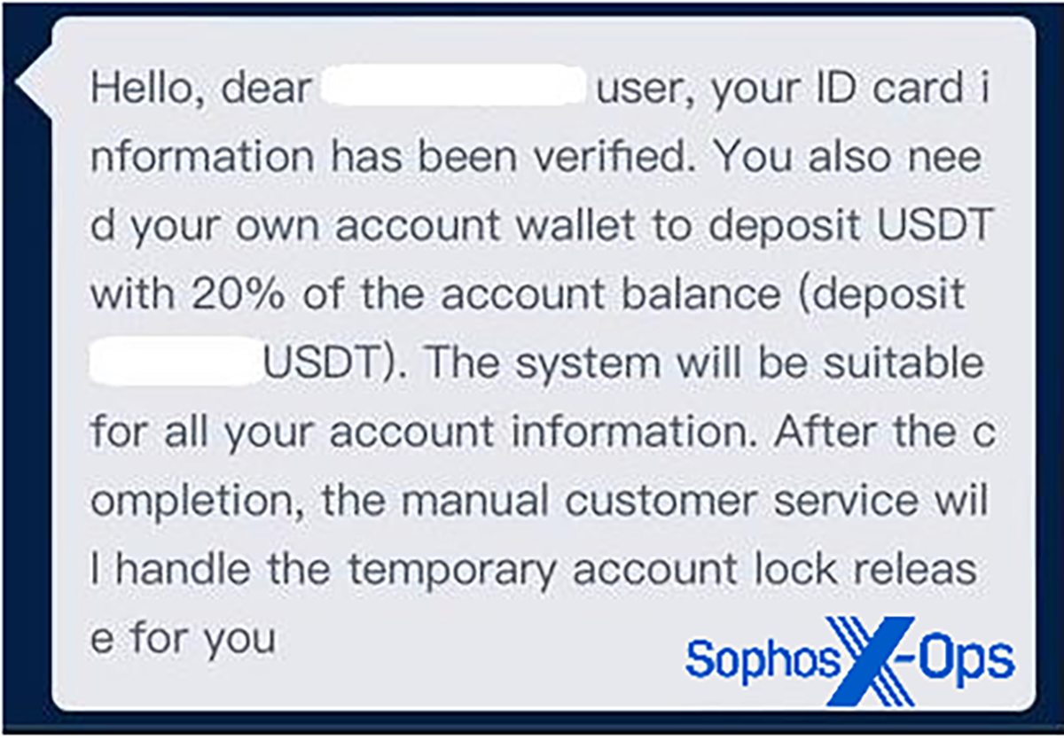Initialement, la victime a pu retirer de petites quantités de cryptomonnaie. Mais plus tard, lorsque la victime a voulu retirer des montants plus importants, le compte a été verrouillé et on lui a dit via un chat “support client” dans l’application même de payer des frais de 20% (comme illustré à la figure 3) pour accéder à la cryptomonnaie.