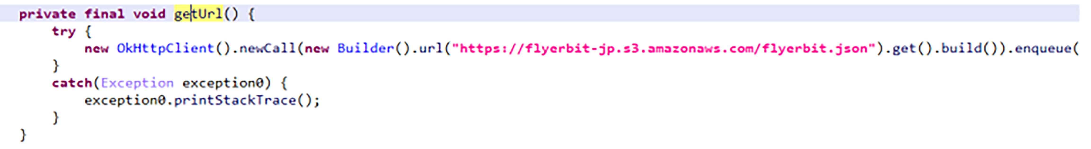 Figure 13 : La version Android de la méthode getUrl de l’application MBM_BitScan, avec une URL basée sur AWS qui récupère les données JSON contenant l’interface CryptoRom