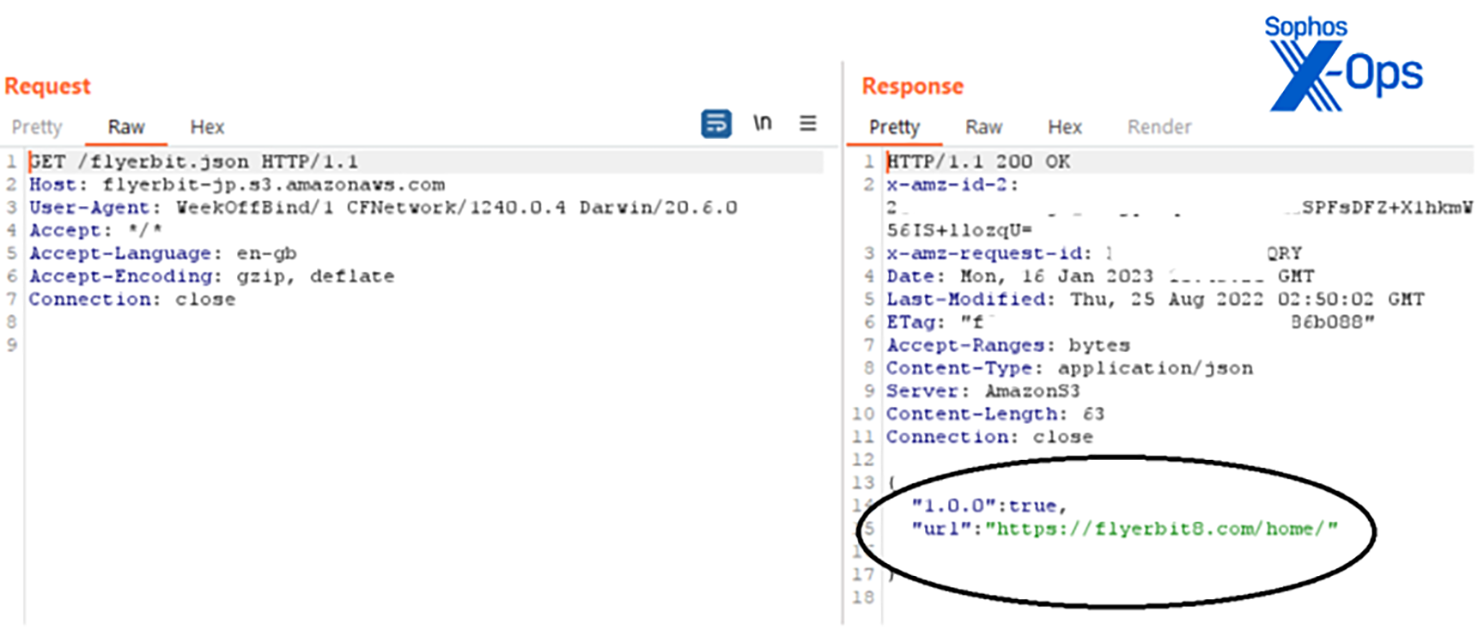 L’application MBM_BitScan utilise une approche similaire. Lors de l’exécution, elle envoie une requête JSON à un serveur command-and-control (C2) hébergé sur Amazon Web Services et obtient une réponse d’un domaine appelé flyerbit8(.)com, un domaine conçu pour ressembler à celui du fournisseur de bitcoin japonais légitime, bitFlyer :