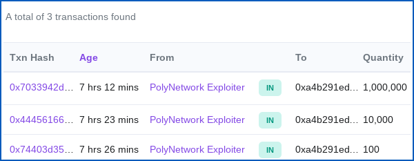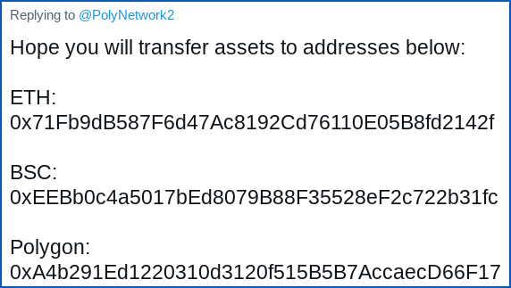 Update. Another $84m was returned via this wallet at about 2021-08-12T20:00Z. The BSC address listed in Poly Networks tweet above has seems to have received just over $250m. [2021-08-12T00:45Z] On Thursday evening, at 2021-08-12T17:22Z, Poly Networks tweeted to say that a bunch more assets had been returned, but that “the repayment process has not yet been completed”. [2021-08-13T11:130Z]