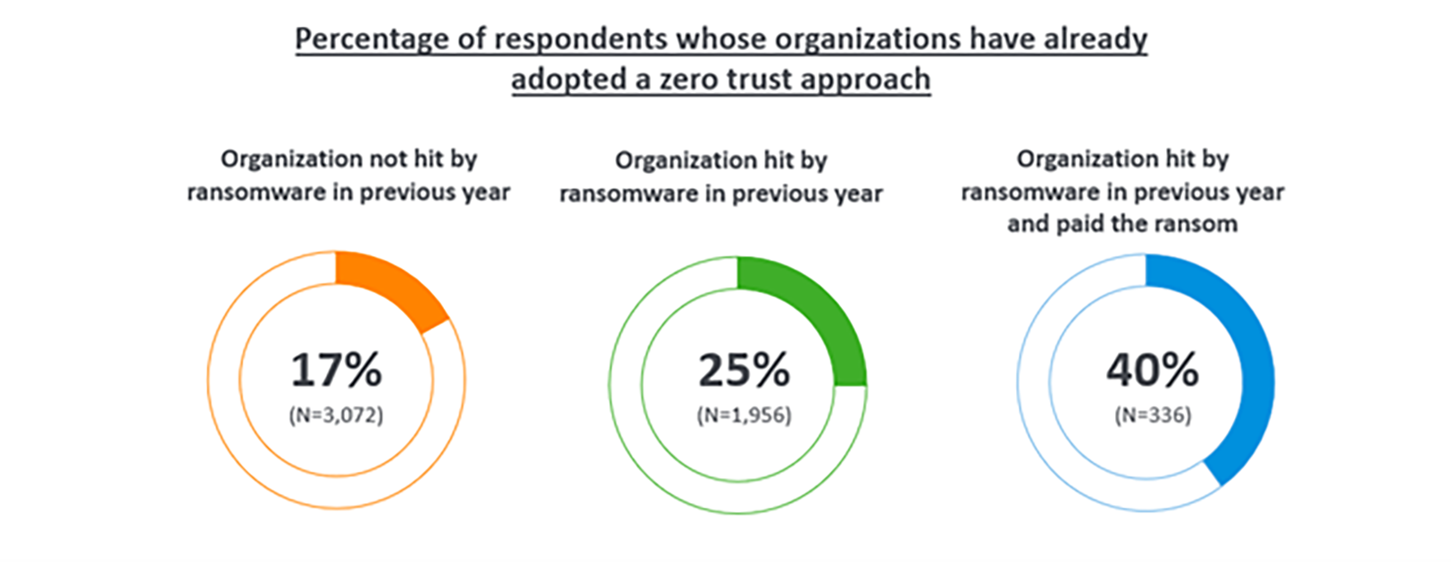 Un quart (25 %) de ceux dont l’entreprise a subi une attaque de ransomware au cours de l’année précédente ont déjà pleinement adopté une approche Zero-Trust. Ce chiffre passe à 40 % pour ceux dont les entreprises ont été touchées et ont payé une rançon. En comparaison, seulement un sixième (17 %) de ceux qui n’avaient pas subi d’attaque ont déjà entièrement migré vers cette approche.