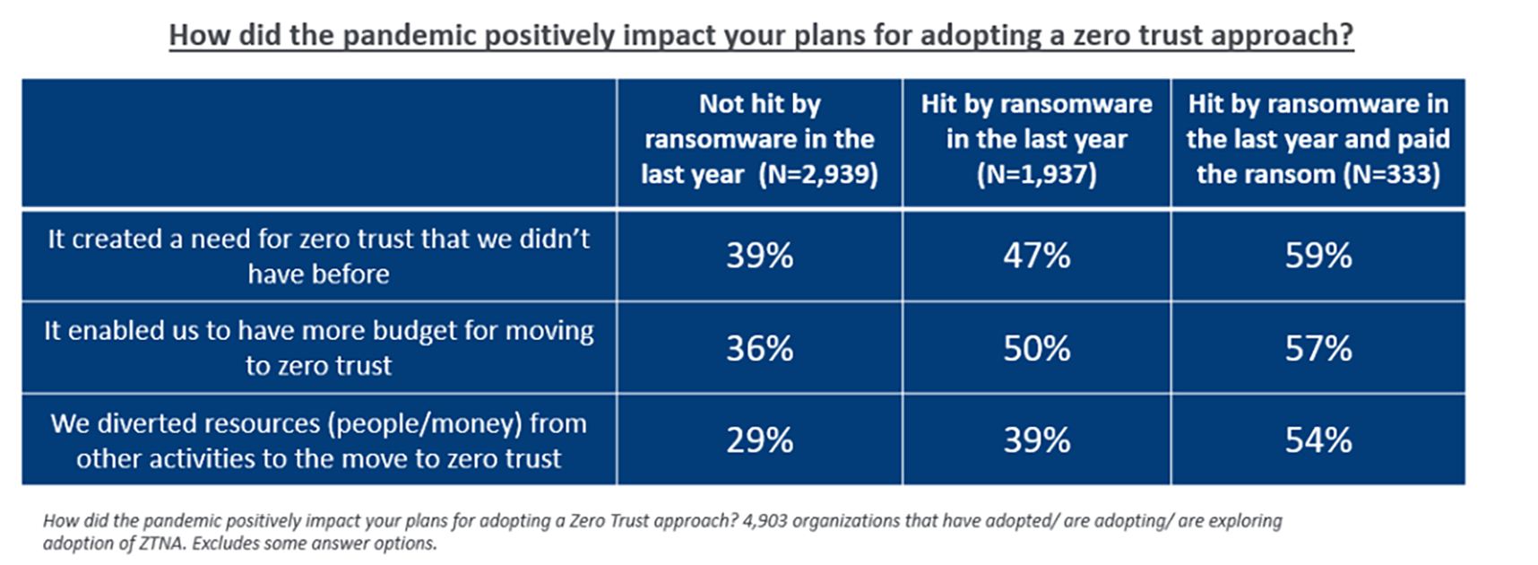 Les résultats de l’enquête soulignent que les entreprises qui ont été victimes de ransomwares et qui ont payé une rançon étaient les plus susceptibles de subir un impact positif de la pandémie sur leur adoption du Zero-Trust. Il semble que le souvenir douloureux d’une attaque de ransomware ait fortement incité l’entreprise à mieux mitiger un potentiel incident futur.