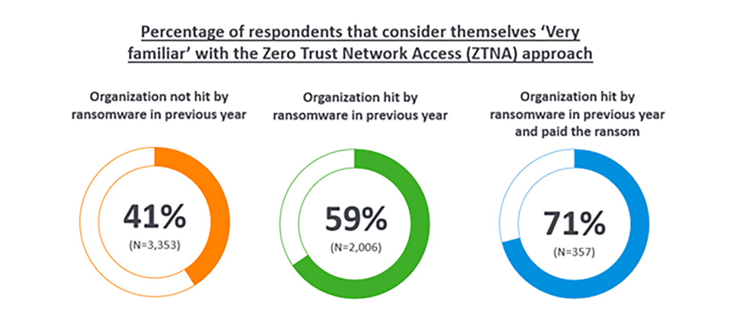 Les professionnels IT dans les entreprises qui ont été touchées par un ransomware au cours de l’année précédente sont près de 50 % plus susceptibles d’être “très familiers” avec l’approche ZTNA que ceux dont les entreprises n’ont pas connu d’incident (59 % contre 39 %). Ce chiffre monte à 71% parmi ceux dont les entreprises ont été touchées et ont payé une rançon.