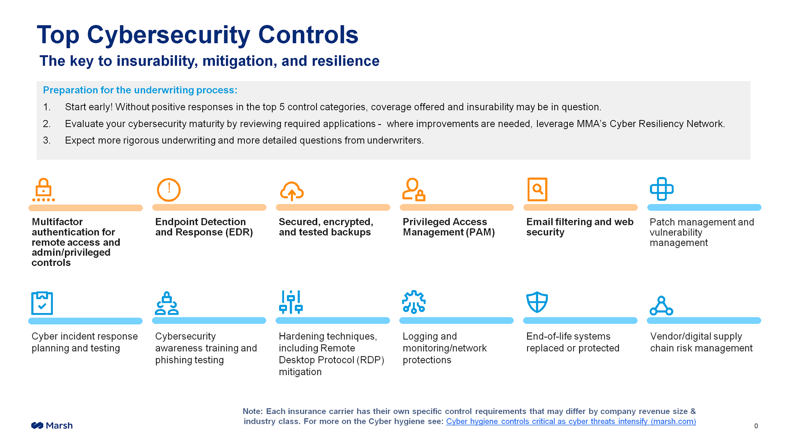 Insurance broker Marsh McLennan Agency (MMA), which serves customers worldwide, has 12 security controls that it deems essential for an organization to employ, but five that it puts at the top tier of the most basic security controls that potential clients must have.