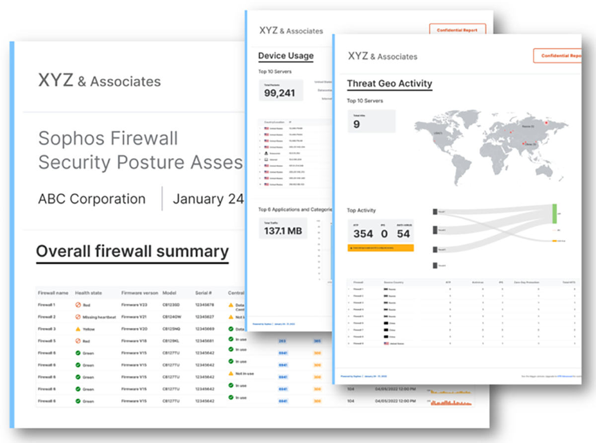 Security Posture Assessment) vient d’être ajouté à Sophos Central Firewall Reporting. Ce rapport personnalisable fournit un aperçu au niveau de la gestion de l’activité de protection du pare-feu qui constitue un excellent outil pour afficher la valeur et la protection que Sophos Firewall est en mesure d’offrir. Un tout nouveau rapport d’inventaire est également inclus qui fournit un instantané au niveau de votre inventaire de pare-feu, de votre état de sécurité et de vos détails de licence.