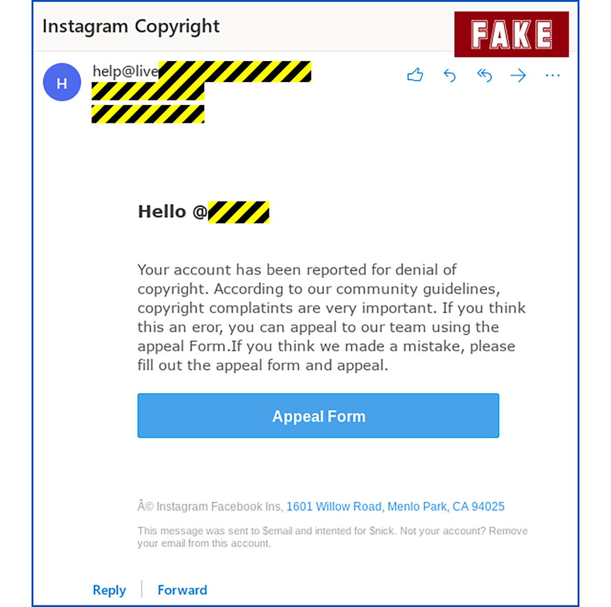 Au cours des derniers jours, nous avons reçu de faux avertissements Instagram, avec la marque Instagram, dans chacune des catégories suivantes :