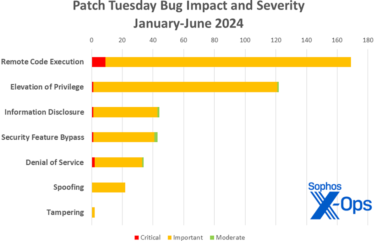 Figure 3 : Alors que nous avançons dans cette année 2024, les vulnérabilités de divulgation d’informations devancent légèrement les problèmes de contournement des fonctionnalités de sécurité, mais les RCE continuent de se maintenir en tête de peloton.