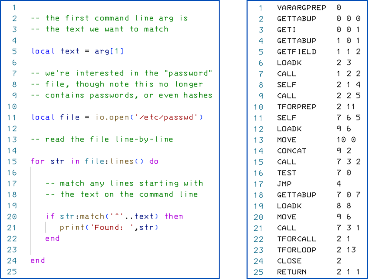 Par exemple, pour illustrer de manière synthétique mais facile à comprendre, comparez le code source Lua à gauche ci-dessous avec le bytecode compilé (comme Java, Lua s’exécute sur une machine virtuelle) à droite :