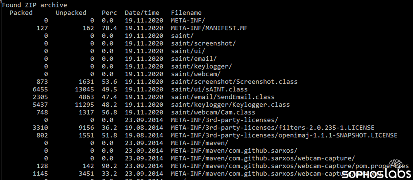 Dans un autre cas, nous avons trouvé un programme d’installation (installer) malveillant d’une version modifiée de Minecraft. Ce dernier fournit en fait une version complète du jeu créatif et populaire de construction de blocs, mais avec une légère modification. Déguisé en “mod” avec des fonctionnalités spéciales appelées ‘Saint’, le programme d’installation de Minecraft a fourni une application Java capable de capturer des frappes sur le clavier, réaliser des captures d’écran du système de la cible et prendre des photos à partir de la caméra de l’ordinateur infecté. Les classes Java à l’intérieur du fichier sont une indication évidente des capacités du malware.