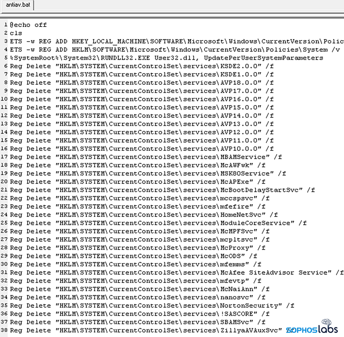 Alors que quelques-uns des fichiers ont généré des codes qui ressemblent à ceux utilisés pour mettre à niveau un compte Discord standard vers la version Discord Nitro, la plupart des autres ne l’ont pas fait. L’un des exemples utilise un script batch qui tente de supprimer les clés de registre et de mettre fin aux processus ou services de dizaines d’outils de sécurité endpoint. Ce script “antiav.bat” s’exécute à partir du répertoire %TEMP% sur le système immédiatement après le lancement du programme par l’utilisateur.