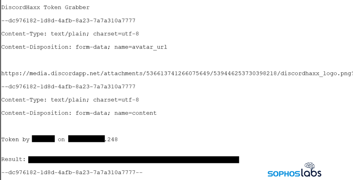 Dans de nombreux cas, ces valeurs de jeton ont été envoyées directement à d’autres canaux Discord ou comptes utilisateur via l’utilisation de la propre API de Discord, au moyen d’une requête HTTPS POST vers une URL spécifique sur Discord. De temps en temps, nous tombions également sur un malware qui tentait d’envoyer les données vars un canal sur Slack.