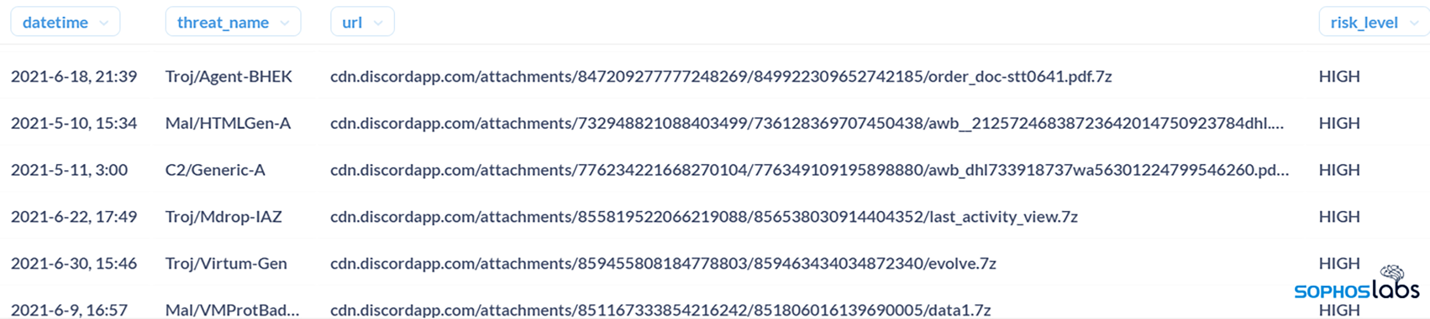 Les abus dont Discord a été la cible, comme l’abus de tous les services Web, n’est pas un phénomène nouveau, mais il est en pleine croissance : les produits Sophos ont détecté et bloqué, au cours des deux derniers mois, près de 140 fois plus de détections que sur la même période en 2020. En avril, nous avons signalé, aux représentants de la plateforme, plus de 9 500 URL uniques hébergeant des malwares sur le CDN de Discord.