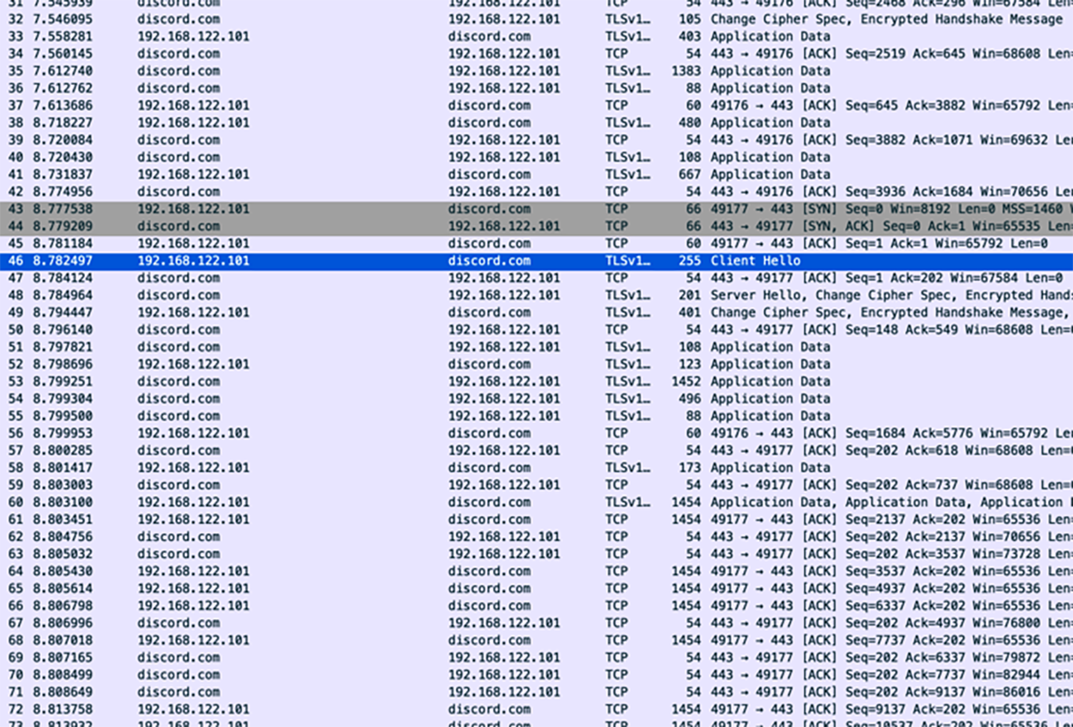 Une capture de paquet du “crasher” accédant à l’API de Discord.