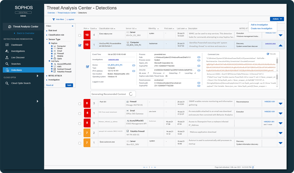 Si un analyste souhaite investiguer une détection, Sophos lui fournit des informations contextuelles disponibles à tout moment. Les opérateurs peuvent alors accéder à de précieuses informations, telles que la première et la dernière fois qu’une détection a été effectuée, une description de la détection, la géolocalisation de l’appareil, l’utilisation de binaires de type Living-Off-the-Land (LOL-bin), comprenant des lignes de commande, des relations parents/enfants, un nom de processus, un hachage ainsi que d’autres points de données.