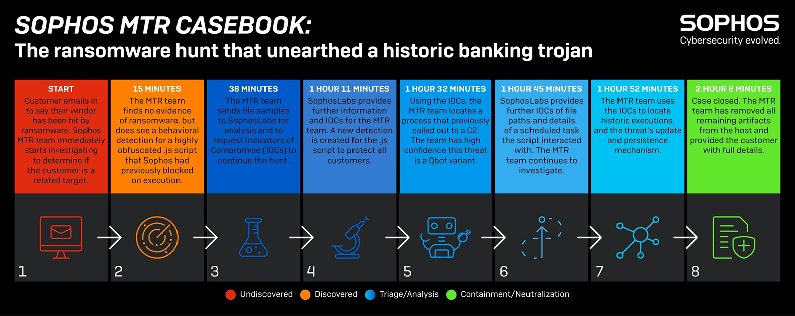 Dans cet exemple concret, un nouveau client Sophos a pris contact avec nous pour nous informer que l’un de ses éditeurs avait été touché par un ransomware et qu’il craignait d’avoir également été infecté. L’équipe Sophos MTR a immédiatement commencé à investiguer, en collaboration avec nos experts des SophosLabs. Ils ont rapidement réalisé qu’il n’y avait aucun indice prouvant qu’une attaque de ransomware avait été lancée. Mais plutôt que de simplement clôturer le cas, l’équipe Sophos MTR a poursuivi son investigation et a découvert un cheval de Troie bancaire historique. En moins de deux heures et six minutes, l’incident dans son ensemble avait été investigué et traité.