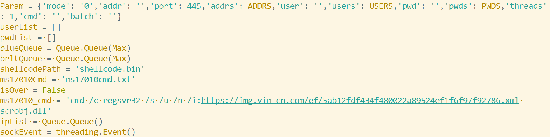 Slight changes were made to the EternalBlue module that MyKings uses. During exploitation, the bot executes a payload script (ms17010_cmd). This usually is a downloader script, which was significantly simplified.