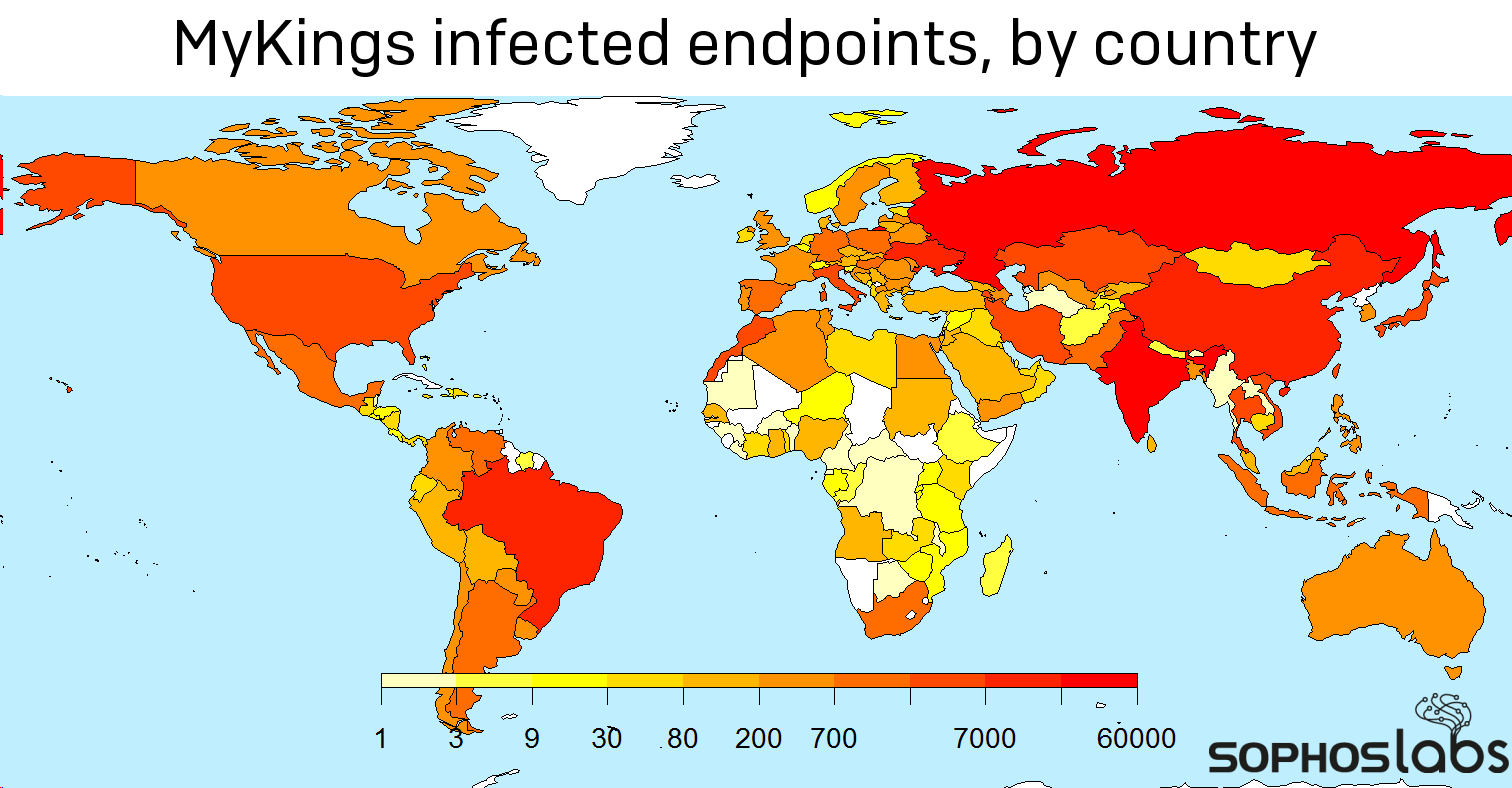 The MyKings botnet components may be detected by Sophos endpoint security products as Troj/Agent-BAKV, Troj/Agent-BAWU, Troj/DwnLdr-XOD, Troj/DwnLdr-XHH, Troj/Miner-WR, Mal/Miner-C, VBS/Dwnldr-MDQ, or XMRig Miner (PUA).