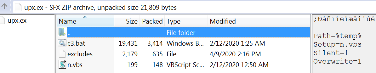 The second file in the package, named upx.exe, is a WinRAR SFX dropper that contains c3.bat, the main installer component of the botnet.