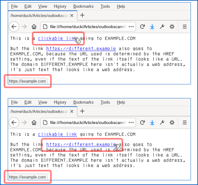 This is a <A HREF='https://example.com'>clickable link</A> going to EXAMPLE.COM But the link <A HREF='https://example.com'>https://different.example</A> also goes to EXAMPLE.COM, because the URL used is determined by the HREF setting, even if the text of the link itself looks like a URL. The domain DIFFERENT.EXAMPLE here isn't actually a web address, it's just text that looks like a web address.