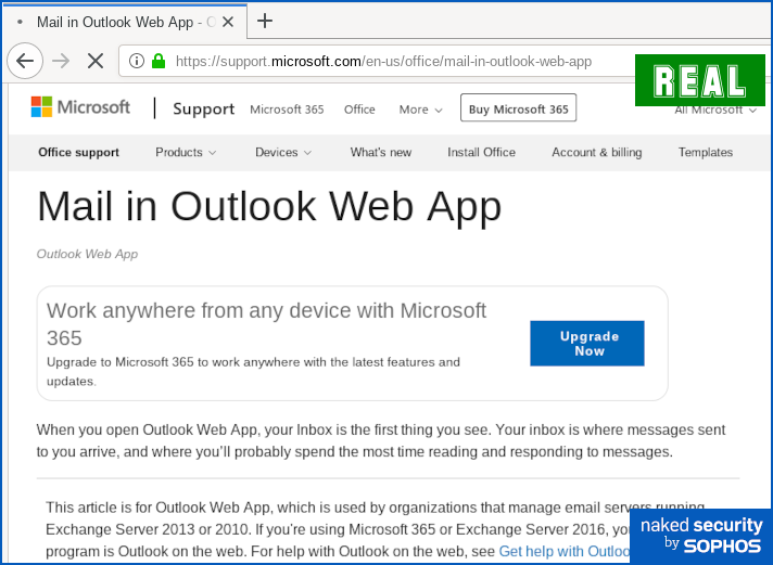 That’s what happened here – it’s not perhaps exactly the page you might expect, but it’s believable enough because it leaves you on a genuine Outlook-related web page with a genuine Microsoft URL: