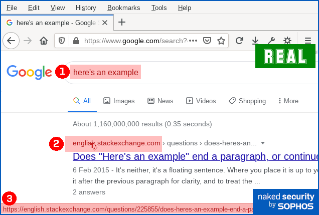 You can see that if you ① search for here's an example, you’ll receive a answer in which ② an explicit domain name (in this case, english.stackexchange.com) is used as the visible text of a clickable link.