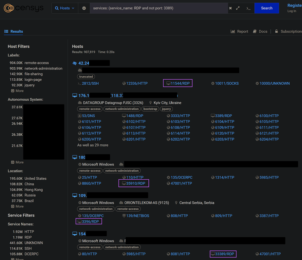 Figure 2 : Comme on le voit sur Censys, le fait de “masquer” un RDP exposé en utilisant un port non standard n’est pas du tout efficace