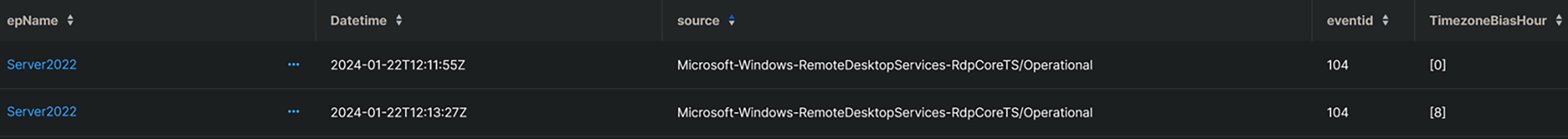 Nous vous recommandons d’exécuter cette requête sur tous les appareils de votre environnement : recherchez autour de vous et identifiez s’il existe des entrées en termes d’écart de fuseau horaire dans les logs ‘RDP Core TS Operational’ qui diffèrent de ce à quoi vous vous attendez à voir généralement.