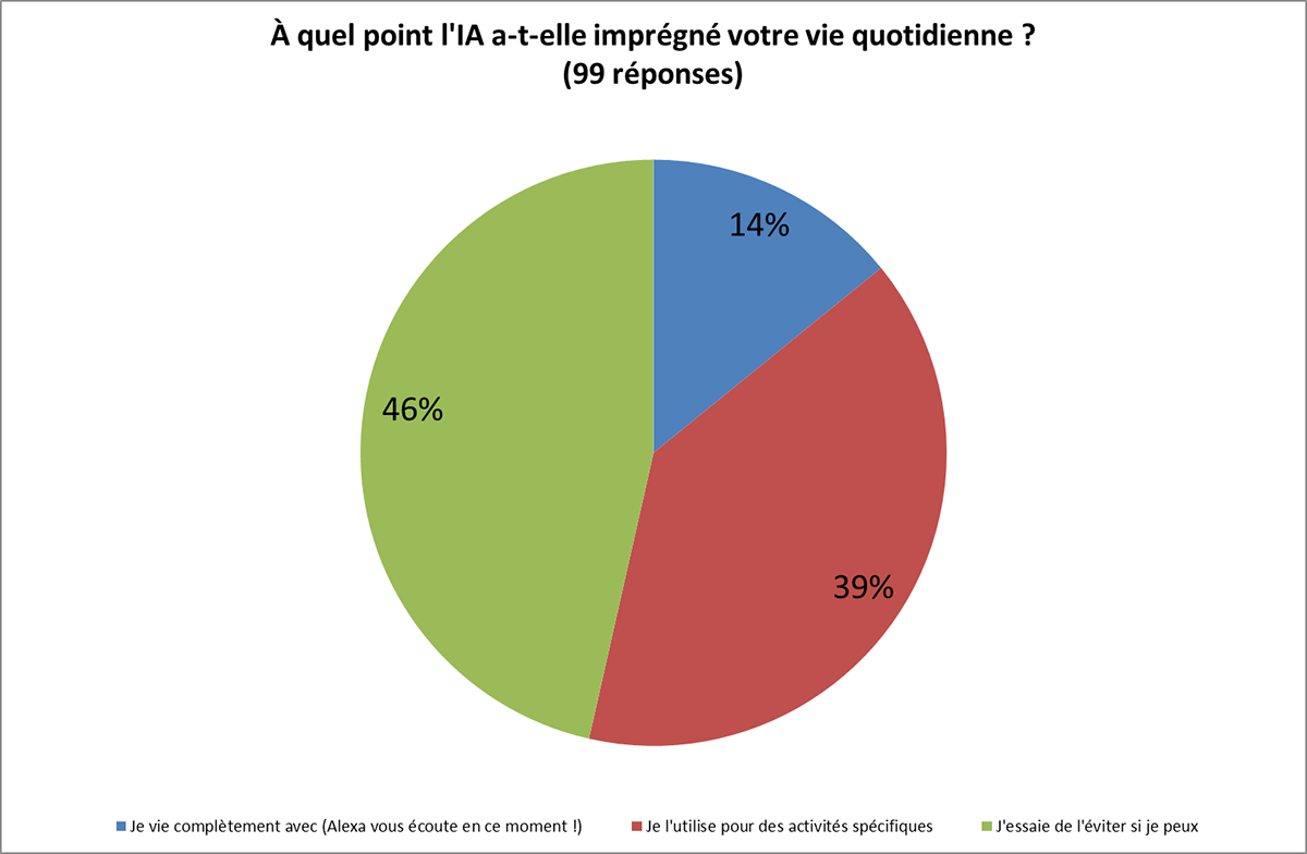 Parmi ces nouvelles technologies, il est important de souligner que l’Intelligence Artificielle (IA) occupe une place de plus en plus importante dans la vie quotidienne. Ainsi, plus de la moitié des participants ont confirmé l’utiliser de manière régulière ou ponctuelle.