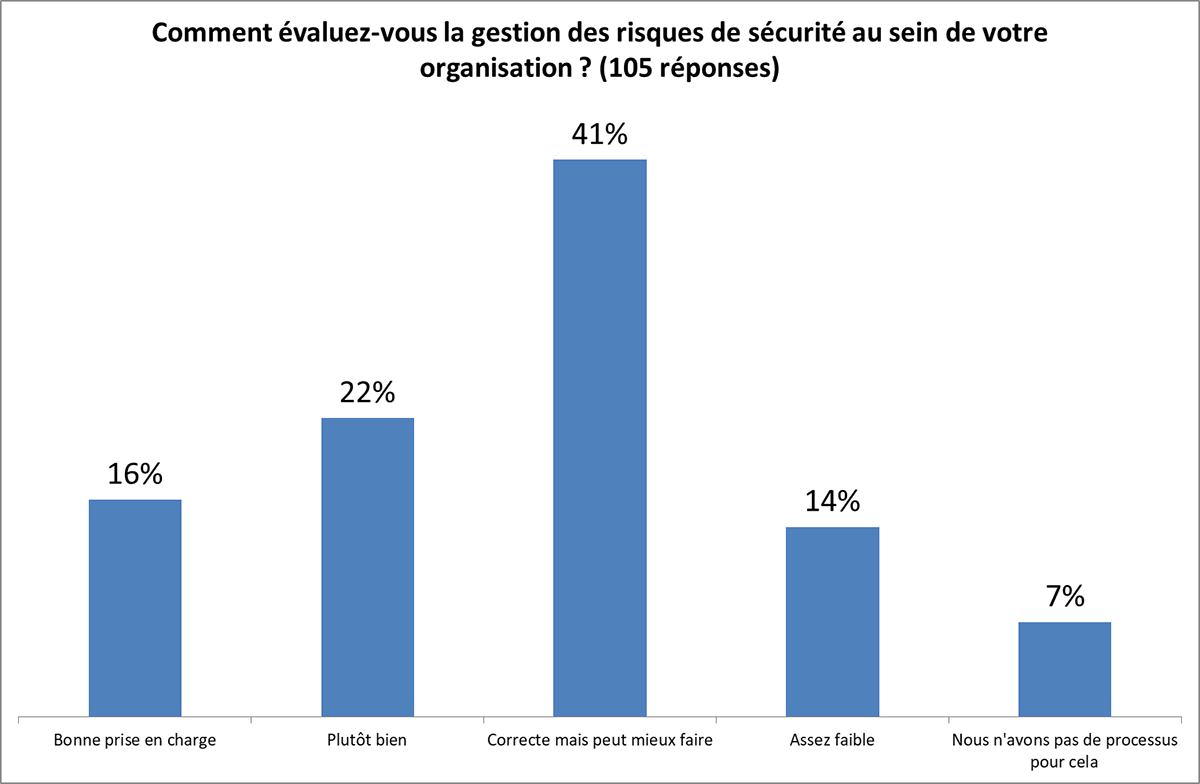 Lorsqu’il s’agit d’évaluer les risques de sécurité, un peu moins de la moitié (41 %) des participants ont évalué leur organisation comme “Correcte mais peut mieux faire”. Un quart estiment qu’ils s’en sortent “plutôt bien” et 16 % estiment avoir mis en place une “Bonne prise en charge”.