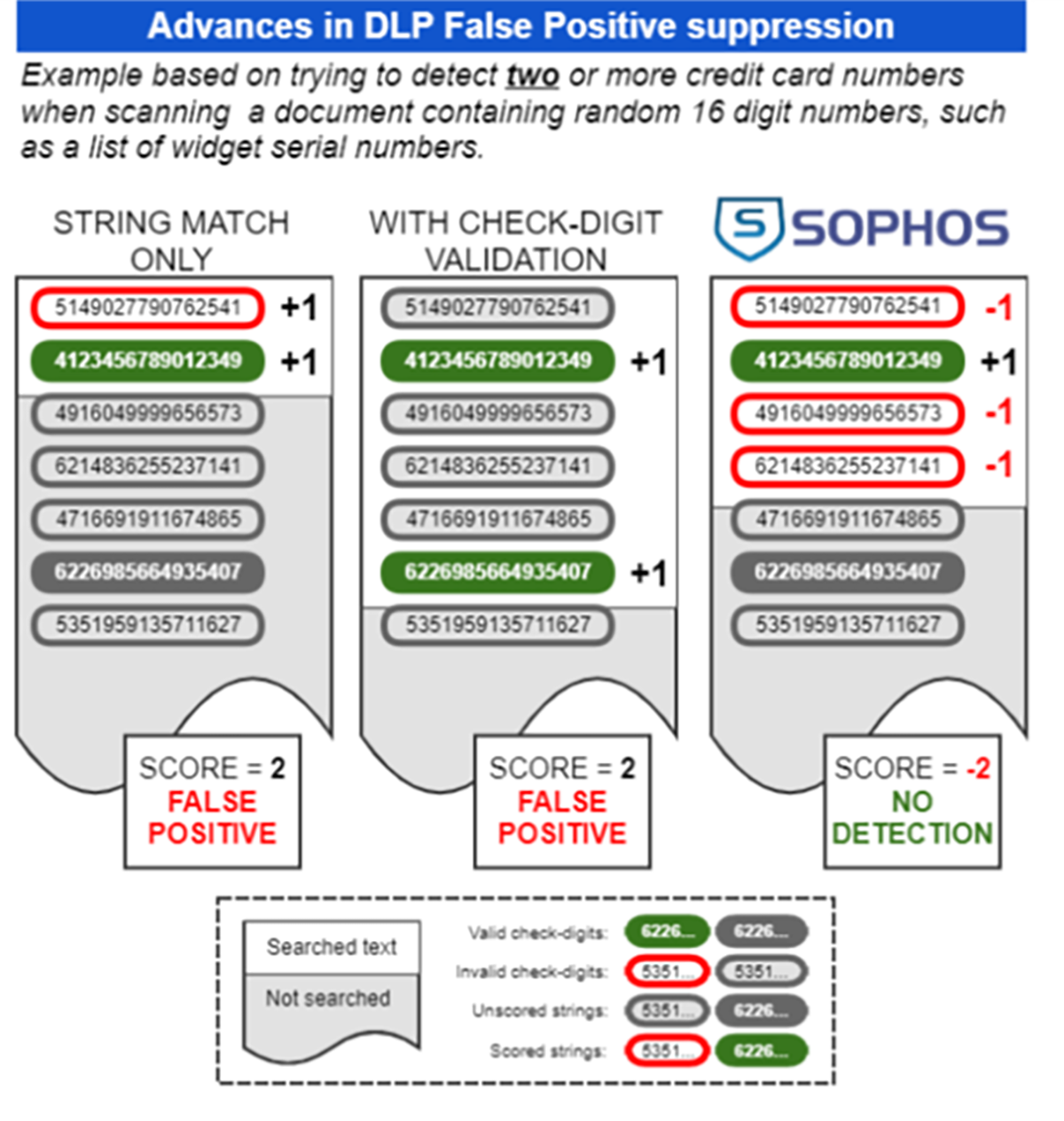 Notre approche, à savoir Sophos DLP avec score négatif, prend en compte non seulement les résultats en matière de correspondance de modèle qui ont des chiffres de contrôle valides, mais également les 90 % de correspondances de modèle aléatoires qui ont des chiffres de contrôle non valides.