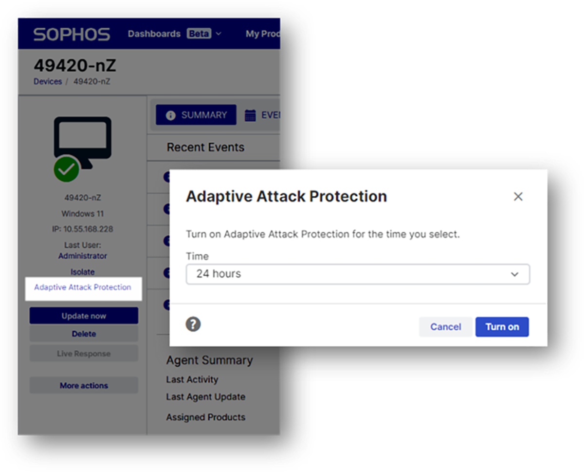 - Plus de contrôle : les clients peuvent désormais activer (et désactiver) manuellement la protection adaptative contre les attaques (Adaptive Attack Protection) sur un appareil pour appliquer une protection plus agressive tout en investiguant une activité suspecte : idéal pour les scénarios dans lesquels l’isolement complet de l’appareil du réseau peut entraîner une perturbation opérationnelle importante de l’entreprise. Vous pouvez également prolonger la durée d’activation de la protection adaptative contre les attaques sur un appareil afin de donner plus de temps pour mener à bien une investigation.