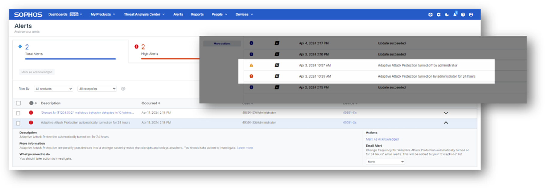 - Augmenter la visibilité : les nouveaux événements et alertes de la protection adaptative contre les attaques (Adaptive Attack Protection) vous avertissent lorsqu’un appareil est attaqué et incitent les experts en réponse aux incidents à prendre des mesures pour neutraliser la menace.
