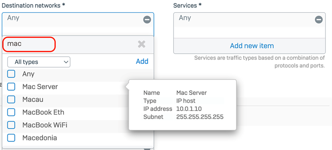 Comme vous vous en souvenez peut-être, nous avons ajouté de nouvelles fonctionnalités de recherche importantes à Sophos Firewall avec la version v19, notamment la possibilité de rechercher n’importe quel paramètre ou élément de configuration dans le système, ainsi que la recherche améliorée d’objets réseau lors de la création de règles :