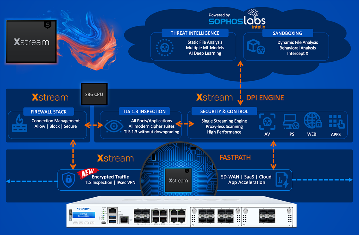 - L’accélération Xstream FastPath du trafic, chiffré TLS, tire parti des capacités cryptographiques matérielles du processeur de flux Xstream pour accélérer les flux de trafic chiffré TLS sur le FastPath des modèles XGS 4300, 4500, 5500 et 6500. Cette capacité fournit des performances supplémentaires pour le trafic qui nécessite une inspection approfondie des paquets (DPI).