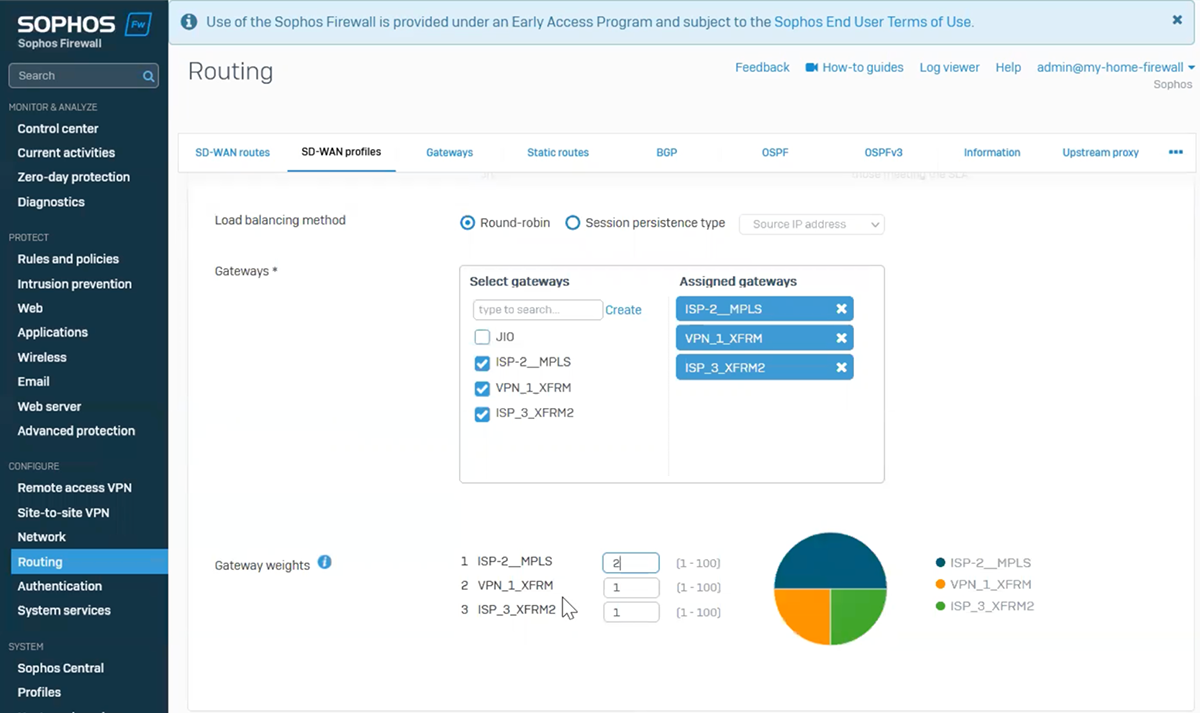 Sophos Firewall v19.5 peut équilibrer la charge du trafic au niveau de plusieurs connexions SD-WAN qui répondent aux critères de performance exigés.