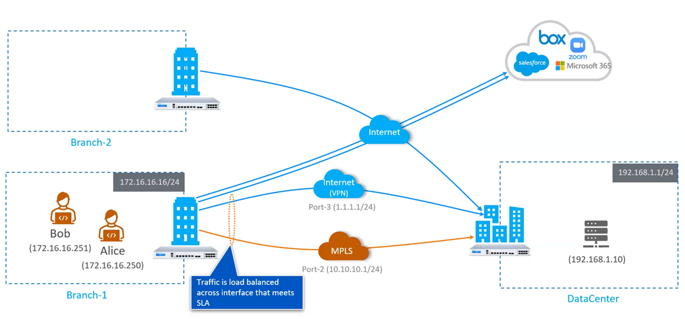 Cette nouvelle capacité d’équilibrage de charge SD-WAN permet le routage simultané du trafic des applications sur plusieurs liens SD-WAN afin d’accroître les performances et la redondance.