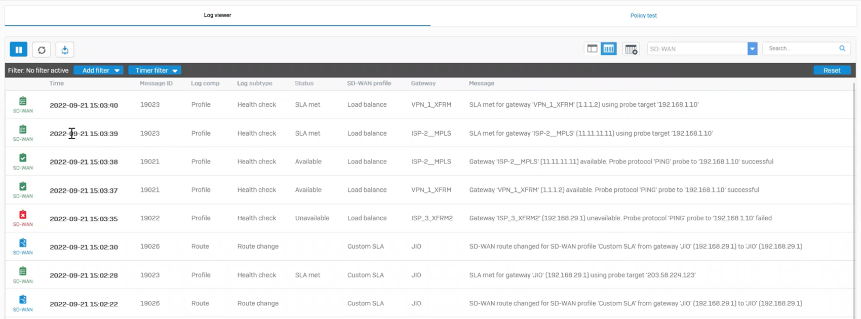 L’état du lien SD-WAN et de l’équilibrage de charge est facilement accessible au niveau de l’écran SD-WAN ‘Profils’ (ci-dessus) ou via la visionneuse de logs et l’écran de suivi des performances SD-WAN (ci-dessous).